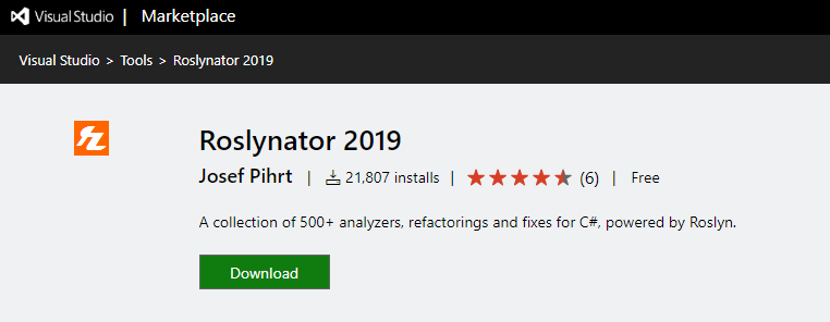 Marketplace Link => https://marketplace.visualstudio.com/items?itemName=josefpihrt.Roslynator2019