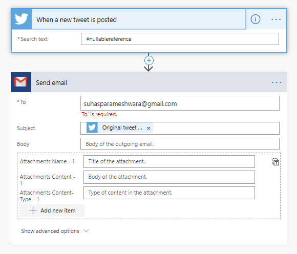 - In the first step i’m using twitter connector and I’m trying to find out the tweet with #nullablereference. And this logic app will run for every 5 minutes.
