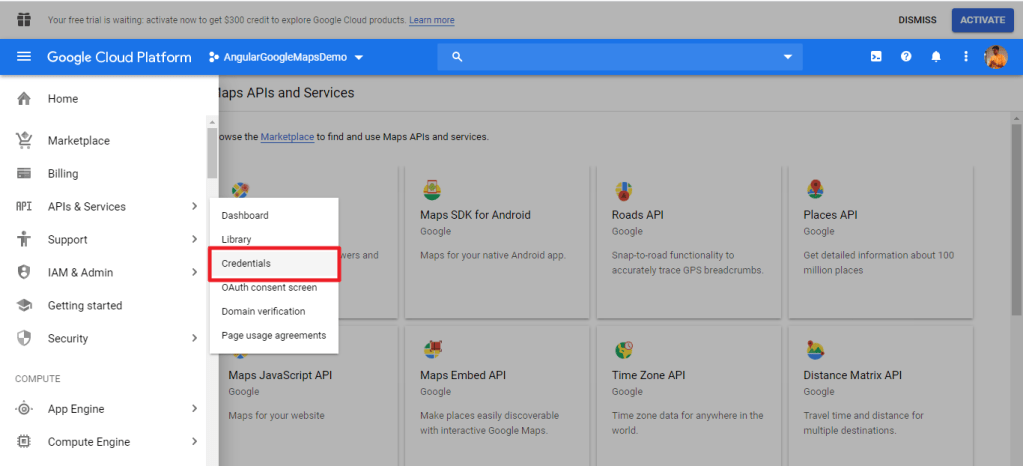 Once the project is created, on the top left we have the menu button, click that and select APIs & Services -> Credentials.